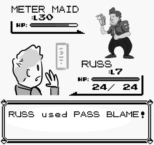 • I died the moment I saw that gif too. I say something like “Sam, make it so I use ‘pass blame’ to defeat the meter maid,” and he responds, “Russ, I have no idea what you’re talking about,” and I’m like, “I dunno, like Pokemon or something.”