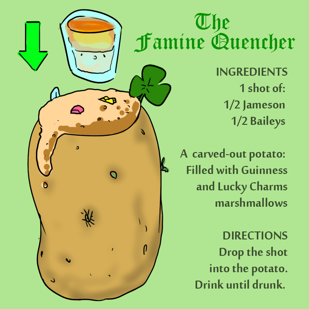 I think it’s something like that. Now, on St. Patrick’s Day in San Luis Obispo, the tradition is to arrive at your first bar around 6 a.m. for a breakfast of Irish Car Bombs. I have a terrible time waking up in the morning, so obviously I had to pull an all-nighter to guarantee I made it. And then we drank all day, hopping from bar to bar forcing green-colored drinks down our throats, most of which contained Bailey’s Irish Cream or potatoes.