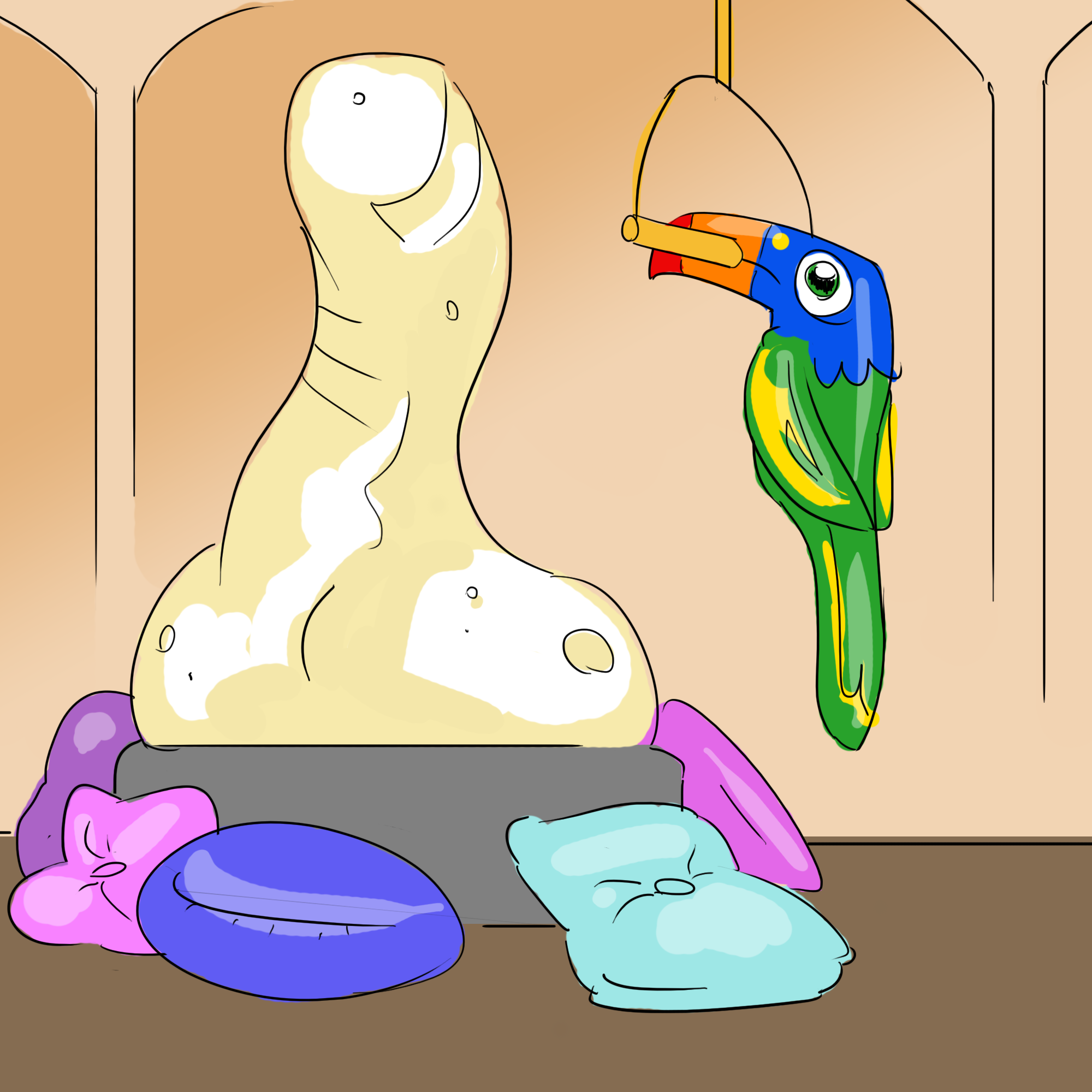 Anyway, for spring break I stayed in a multi-million-dollar beach-front 1970s-style sex grotto mansion that my cousin’s friend’s girlfriend had shadily procured, most likely from a washed up rock star through Craigslist. We lovingly referred to it as the “Rage Palace.” The Rage Palace rested at the top of a cliff overlooking a beautiful beach and slept 18 people (in beds, which is like 40 people in spring break–floor sleeping units). It had clearly done too many heavy drugs in its youth and was now in a bit of disrepair—perfect for a bunch of rowdy college kids. The centerpiece of the erstwhile porn set was a giant, penis-esque fireplace located smack-dab in the middle of the main room, and surrounding the back half of this once-virile hearth was a weird glass chamber filled with clam shells. Extensive investigation into this phallic and yonic fever-dream of architecture revealed that the clam chamber was some sort of group shower or maybe just an enterable waterfall. Either way, its only remaining resident was a stuffed Toucan hung from the ceiling by its beak in a climbing position, a creature perpetually caught in the process of ascension.